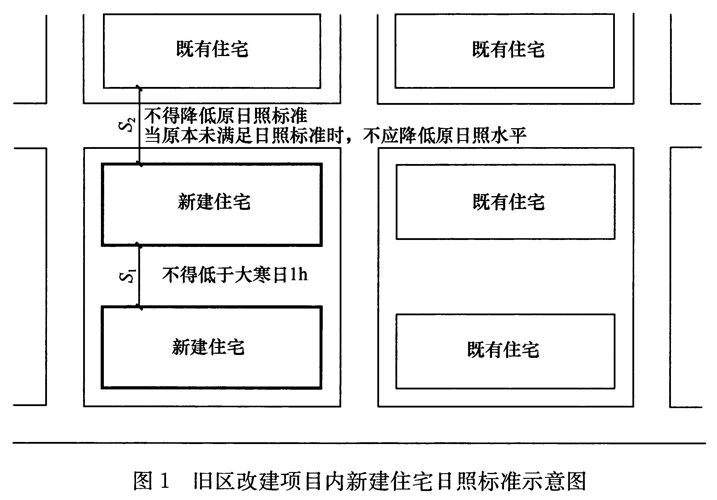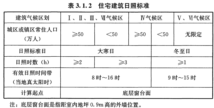 3.1.2 住宅建筑间距应按表3.1.2规定的日照标准进行控制。旧区改建项目内新建住宅建筑日照标准不应低于大寒日日照时数1h。