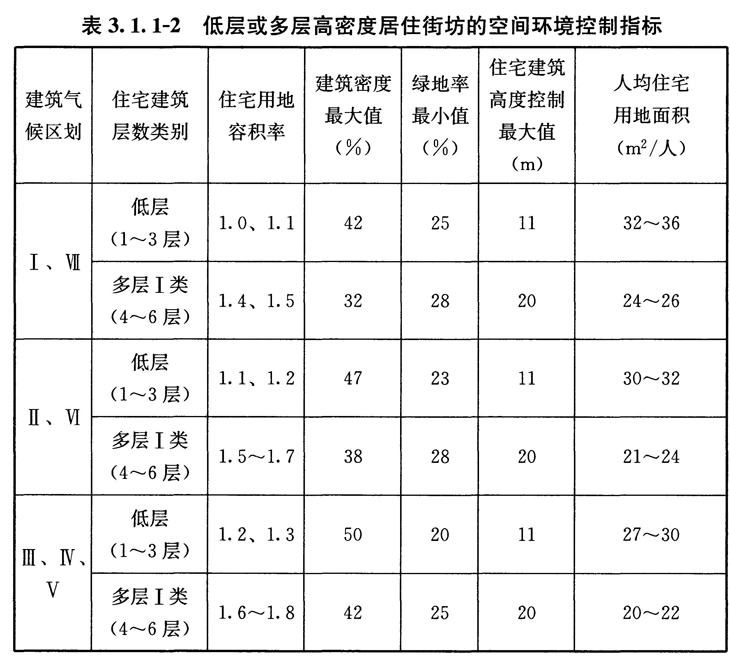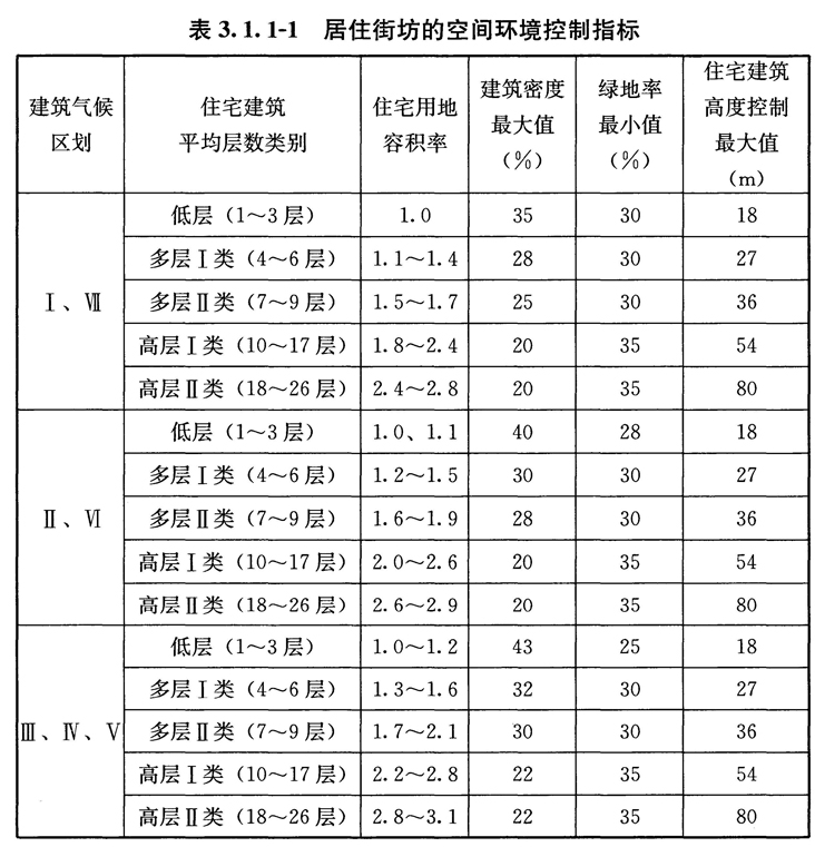 3.1.1 住宅项目应为居民提供宜居的居住生活环境,其居住街坊的空间环境控制指标应符合表3.1.1-1的规定。当住宅建筑采用低层或多层高密度布局方式时,其居住街坊的空间环境控制指标应符合表3.1.1-2的规定。