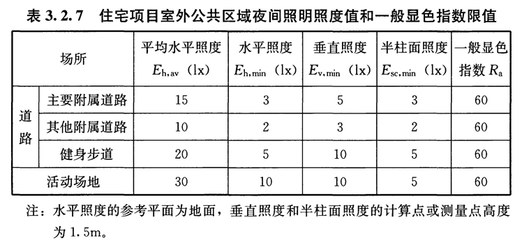 3.2.7 住宅项目室外公共区域夜间照明照度值和一般显色指数不应低于表3.2.7规定的限值。