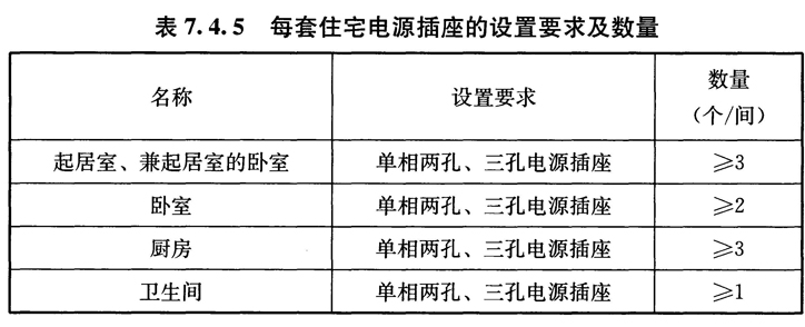 7.4.5 本条规定了住宅套内电源插座配置的最低要求。除另有要求的情况外,起居室空调器电源插座可按柜式空调或壁挂式空调预留;厨房3个电源插座的预留量不包括使用电炉所需的电源插座数量。