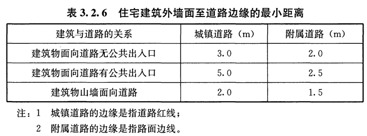 3.2.6 住宅建筑高度大于10m时,外墙面至道路边缘的最小距离,应符合表3.2.6的规定。