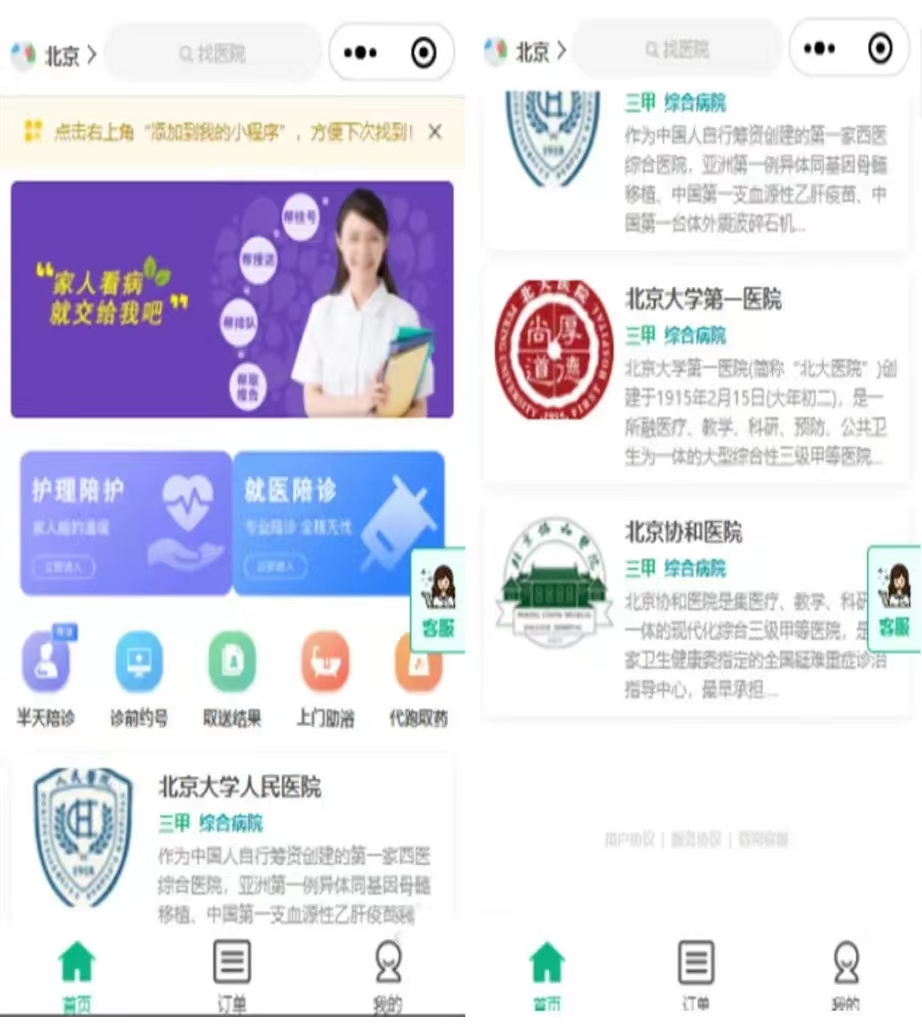 应用适合:A.正在兼职或全职进行陪诊服务的个人,通过小程序对外提供服务,可瞬间建立信任度和品牌形象,并通过小程序发展壮大自己的陪诊团队。