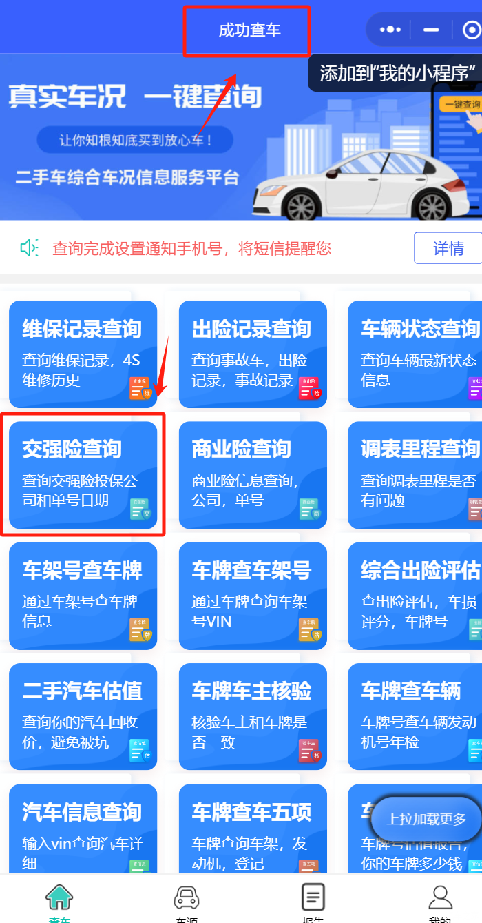 微信小程序:一些保险公司提供专门的微信小程序用于查询保单信息。比如微信小程序【成功查车】,打开微信搜索【成功查车】,找到交强险查询。