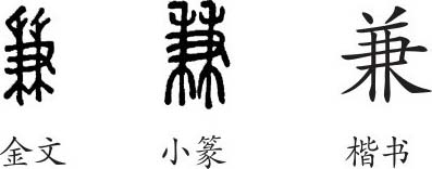 “兼”是会意字。金文像一只很长的右手抓了两棵禾苗。小篆与金文的写法基本上相同。隶变后楷书写作“兼”。