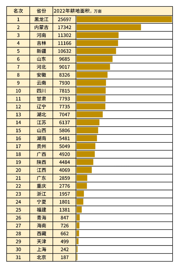 中国各省的耕地面积情况差异显著,各地区的耕地面积分布不均。农业资源分配上的不同情况,也体现了中国农业发展的地域特色。