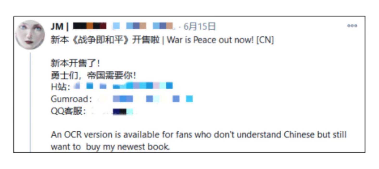 据新京报报道,全国“扫黄打非”工作小组办公室微信公众号披露,近期,网民反映淫秽漫画作者JM通过互联网涉嫌非法销售淫秽色情、血腥暴力漫画《战争即和平》《帝国社会》,接到举报线索后,已第一时间部署辽宁省“扫黄打非”部门进行核查侦办。