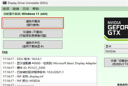 “安全模式”下启动DDU后,在右侧选项中选择要卸载的驱动品类“显卡”,然后选择对应的品牌,如NVIDIA、AMD或Intel;点击“清除并重启”按钮,DDU将开始卸载选定的显卡驱动,并在完成后自动重启电脑。