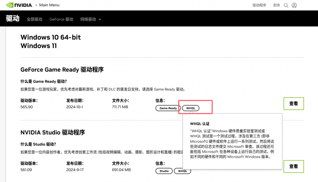 访问显卡制造商官方网站,在网站上找到适用于您显卡型号的最新驱动程序,并下载完整的安装包。注:下载带WHQL 标志的版本,因为是官网验证过的稳定版本)