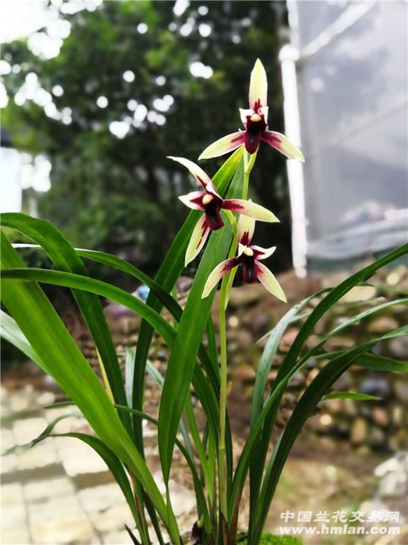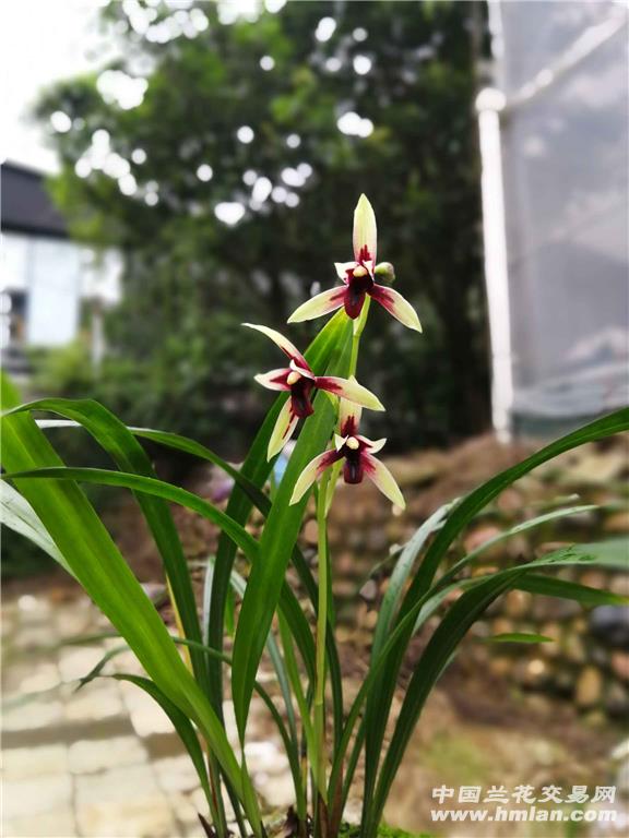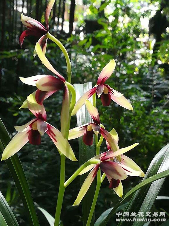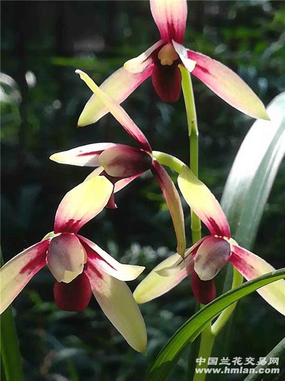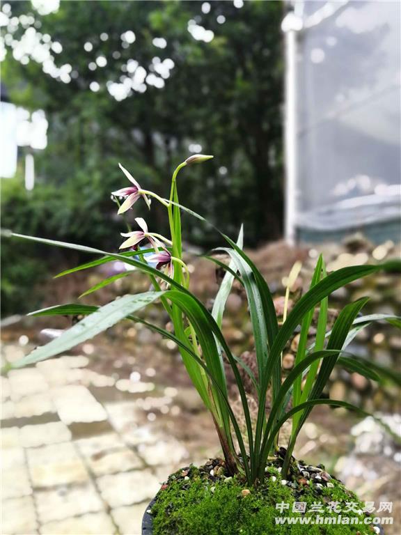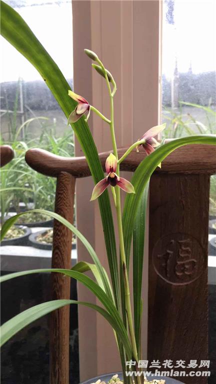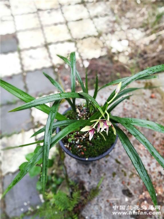 晨光 草型中等, 叶面不平,不规整常起波浪纹,叶片蜡质感强。至主脉表现尤其明显,这是鉴别此草的主要标志。草小花大,花莛高,出架、花型端庄 捧和外三瓣带彩块和红彩晕,花色对比鲜明,颜色亮丽;舌头红得发紫,紫红素舌,寓意大红大紫富贵吉祥如意 一般一杆花有3一5朵 偶见7朵 勤草,勤花,花心和花舌为紫红色,有时为紫黑色 是四季兰中唯一至舌根红完的花 可以传世的珍稀品种。 花茎青色,花色对比明显,颜色极为亮丽,开品稳定,花香,嫩草时有龙抬头现象,此草的最大特征新苗包壳上有明显的紫黑色细丝,至主脉表现尤其明显,也是鉴别此草的重要标志之一!