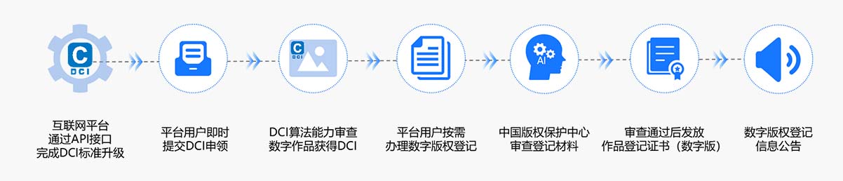 数字版权登记是中国版权保护中心牵头的《基于数字版权链(DCI体系3.0)的互联网版权服务基础设施建设与试点应用》项目的创新业务。 该业务主要面向互联网平台开展。互联网平台可通过技术服务方提供的API接口完成DCI标准化升级,升级后即可面向平台用户提供“即时申领DCI,按需办理数字版权登记”的版权权属确认服务。