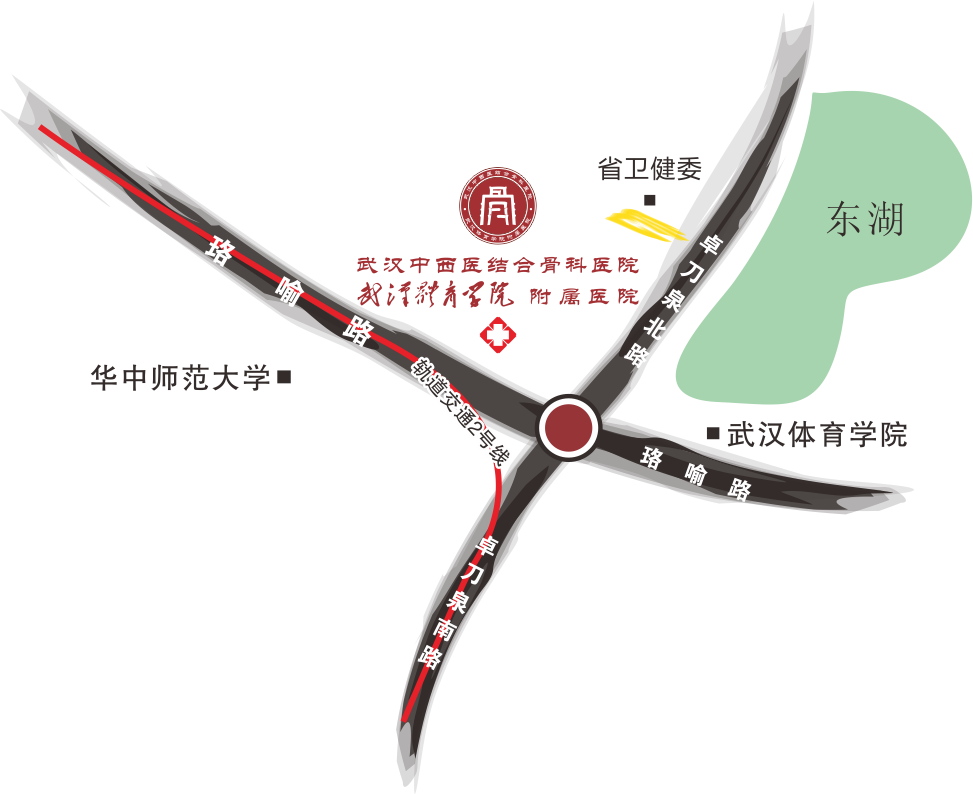 武汉市区内乘坐各地铁线路到2号线广埠屯下车,H出口出站后沿着珞喻路,向光谷方向步行约300米,马路左侧即是医院大楼。