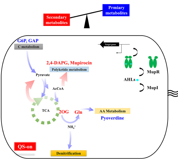 群体感应是细菌通过化学信号分子感知群体密度并调节基因表达的机制。细菌通过生成和响应自诱导信号分子来协调诸如抗生素生成、铁获取和生物膜形成等重要行为,这一机制对于细菌的生态适应性、群落动态及入侵机制至关重要。尽管群体感应在细菌的生物行为中扮演着关键角色,细菌的代谢和群体感应之间的关系仍不完全明确,特别如何通过群体感应信号来平衡“公共物品”(群体共享的代谢产物)与“私人物品”(个体所需的代谢物)的生产,这仍然是一个未解的问题。本研究以应用于农业的植物促生菌荧光假单胞菌Pseudomonas fluorescens 2P24为模型,探讨了群体感应在细菌代谢网络中的作用,尤其是在资源受限或高密度环境下如何优化“公共物品”(如聚酮类抗生素和铁载体)与“私人物品”(如供能代谢物)的生产。研究发现,细菌通过群体感应信号分子的感知和响应,调控碳和氮代谢路径,平衡“公共物品”和“私人物品”的生产。这种机制帮助细菌在资源受限或高密度环境中提高生存适应性。通过转录组学、代谢组学和ChIP-seq等技术手段,研究进一步揭示了群体感应系统如何精细调控代谢网络中的关键节点。群体感应通过转录因子MupR来调节细菌的代谢通量分布,影响碳代谢途径(如三羧酸循环)和氮代谢路径,确保聚酮类抗生素与铁载体的协同生产。在资源有限时,群体感应通过限制呼吸链活性和能量密集型代谢途径,重新分配代谢资源以平衡生长和“公共物品”的生产。当群体感应系统缺失时,荧光假单胞菌会显示出更强的铁载体合成能力,而聚酮类抗生素的合成则被抑制。这表明,细菌在环境条件变化时灵活调整代谢策略,以适应生存压力,这种灵活的代谢调整机制对于细菌在复杂环境中的生存至关重要。