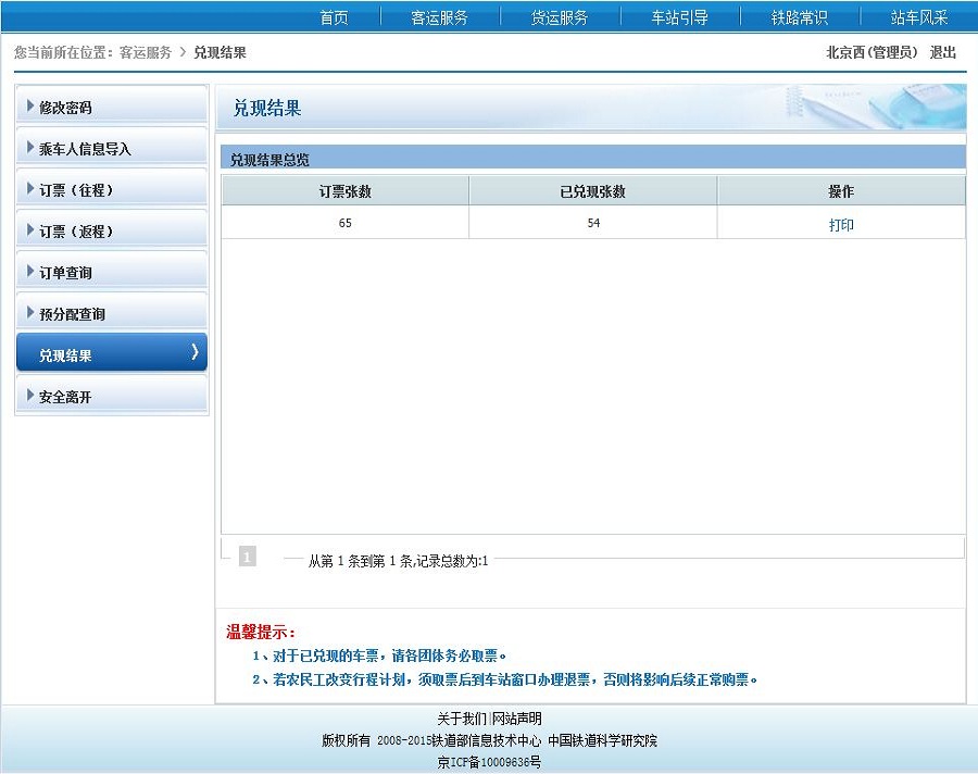 用户登录系统后,点击兑现结果,进入兑现结果界面,即可查看到已兑现的火车票,点击“打印”按钮,即可将兑现的票进行打印。