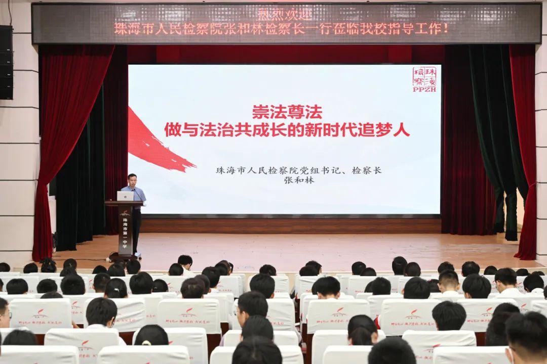 10月14日上午,珠海市第一中学迎来一位特殊的老师——珠海市人民检察院党组书记、检察长张和林。张和林检察长从珠海一中党委书记张六安手中郑重接过聘书,正式受聘为珠海市第一中学法治副校长,聘任仪式后,他以“崇法尊法 做与法治共成长的新时代追梦人”为题,为全校师生们讲授一堂生动的法治课。