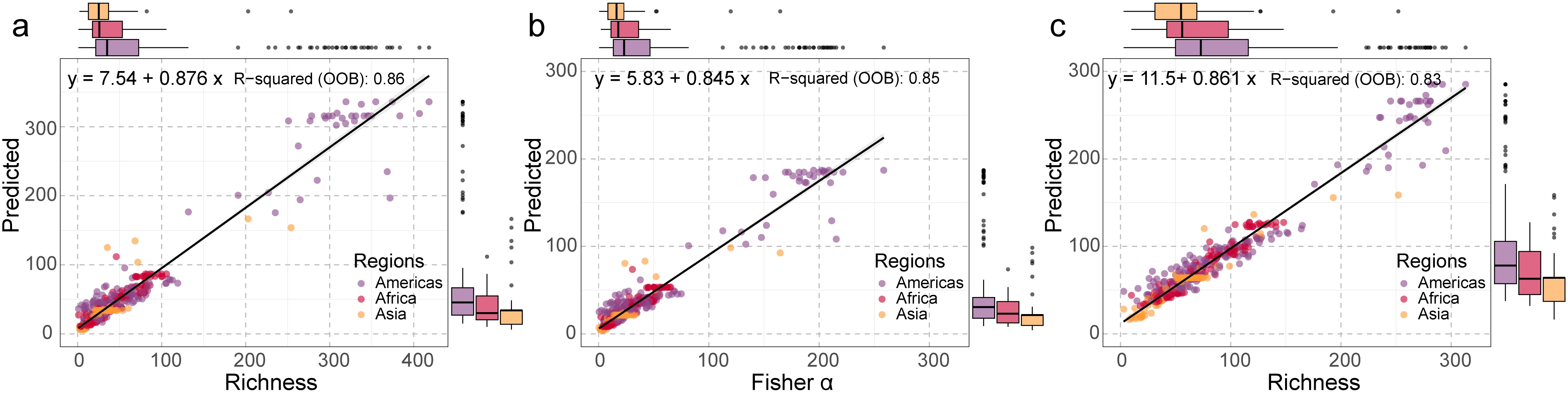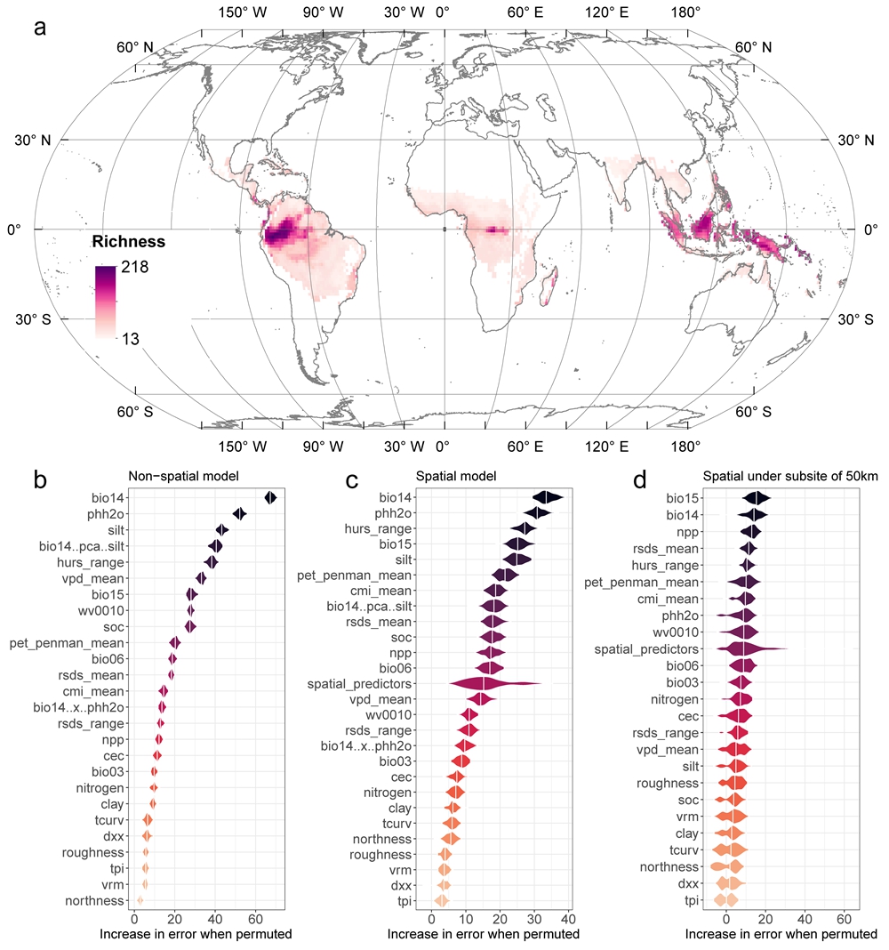 热带地区一直以来都是生物多样性保护与研究的热点。为何不同热带区域之间的物种多样性存在明显差异?例如,与非洲相比,美洲和亚洲的热带森林通常拥有更多的树种。传统观点倾向于将这种差异归因于各地区不同的生物地理历史和演化过程。中国科学院西双版纳热带植物园与南京大学等合作研究发现,当今气候环境而非生物地理历史,才是塑造局域尺度上树种多样性的关键。研究人员整合了来自泛热带地区429个一公顷样方的调查数据,形成了一个覆盖全球主要热带地区的庞大数据库。研究采用了多种分析方法,包括考虑空间自相关的随机森林模型、广义线性模型以及敏感性实验等,综合分析了影响热带森林树种α多样性的驱动机制。为准确衡量多样性,研究团队采用了多种指数,包括基于样本覆盖的稀疏化方法和Fisher's α指数等,确保了研究结果的稳健性。研究结果揭示了明确的环境因子驱动模式:水分可用性是影响树种α多样性的最主要因素,而土壤特性在局域尺度上起着同样显著调节作用。进一步分析表明,这些环境因子存在“共同限制”效应,即热带树种多样性受制于多个环境维度的协同作用,而非单一因子的独立控制。这也解释了为何在亚马逊流域等水热与土壤条件俱佳的区域,会形成全球树种多样性极高的森林群落。值得注意的是,尽管各大洲在地质历史、气候演变和物种库组成上存在差异,但其树种多样性对环境因子的响应模式却表现出高度一致性。这一发现挑战了传统观点,表明热带森林的物种多样性维持机制可能具有普适性,超越了生物地理过程的差异。从理论层面看,该研究从宏观尺度证实了基于环境筛选的确定性过程是塑造热带树种多样性的主要动力。生态位理论认为物种通过适应特定环境条件并减少竞争来实现共存,因此环境能预测多样性。研究所揭示的环境和多样性间紧密且可预测的关系,为生态位理论所强调的环境过滤与资源互补等机制提供了强有力的实证支持,凸显了生态位过程在大尺度上的多样性格局形成中的主导作用。该研究将有助于我们进一步了解热带地区物种丰富度的驱动机制,也对预测未来气候变化对生物多样性的影响及生物多样性保护具有重要指导意义。相关研究结果以Analogous Environments Across the Tropics Have Similar Levels of Tree Species Αlpha Diversity为题,发表在《国家科学评论》(National Science Review)上。研究工作得到国家重点研发计划、国家自然科学基金以及中国科学院东南亚生物多样性研究中心等的支持。论文链接随机森林模型预测的树种多样性指数对比分析基于非空间自相关和空间自相关的随机森林模型预测热带地区的树种丰富度以及环境变量的重要性排序
