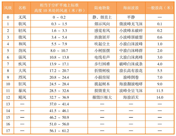 气象服务中,常用风力等级来表示风速的大小。风力是指风吹到物体上所表现出的力量的大小。一般根据风吹到地面或水面的物体上所产生的各种现象,把风力的大小分为18个等级,最小是0级,最大为17级,表达风速的常用单位有三个,分别为海里/小时、米/秒、公里/小时。