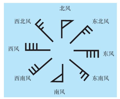 风矢用来表示风,由风向杆和风羽组成。风向杆指出风的来向,有8个方位,分别为北、东北、东、东南、南、西南、西、西北。风羽是指垂直在风向杆末端右侧(北半球)的短划线和小三角,用来表示风速,长划代表4米/秒,短划代表2米/秒,三角形代表20米/秒。