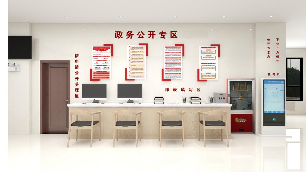 2.同一专区内各个功能区标识设计风格应保持统一,多以蓝白或红白色调为主,专区内要有明显文字标识标注“政务公开专区”。