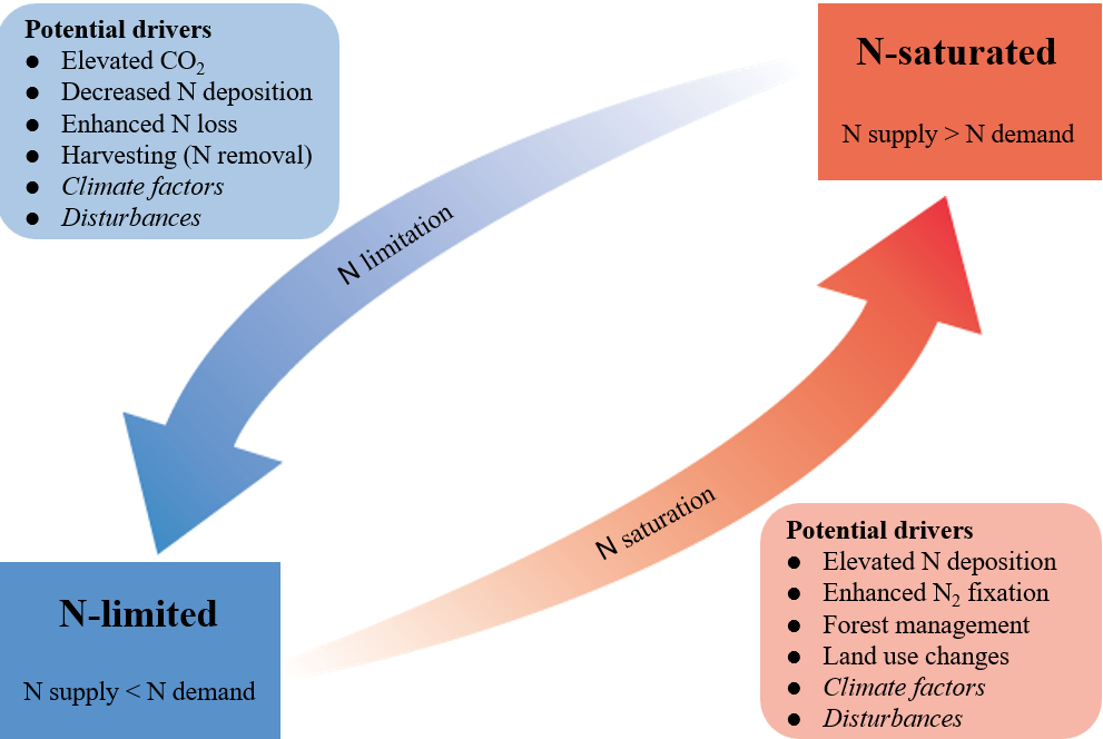 图1 全球变化下森林生态系统氮素状况的双重演变路径,图示在各类区域及全球变化驱动因素的作用下,森林生态系统向氮素饱和状态(红色箭头)或氮素限制状态(蓝色箭头)的转变趋势。