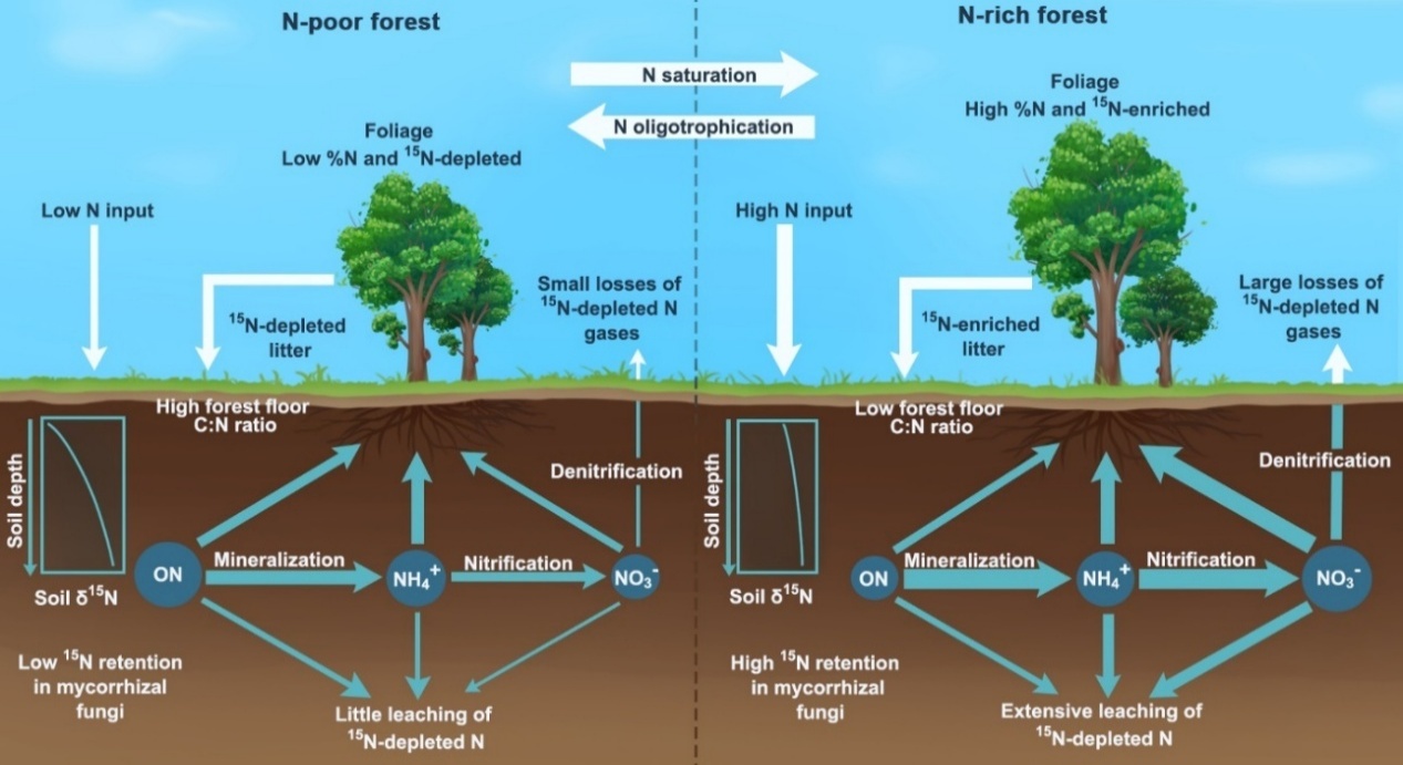 当前,全球变化,如氮沉降、大气CO2浓度升高、气候变暖与降水格局改变等在改变森林生态系统的氮状态。这些全球变化因子可能使森林生态系统趋向于氮限制,也有可能趋向于氮饱和。森林生态系统氮状态的变化对森林生产力、生物多样性及全球碳循环具有重要影响。然而,科学界用于评估森林氮状况的指标繁多,其可比性、敏感性与可解释性尚不明确,这为准确诊断氮状况并预测生态系统响应带来了挑战。