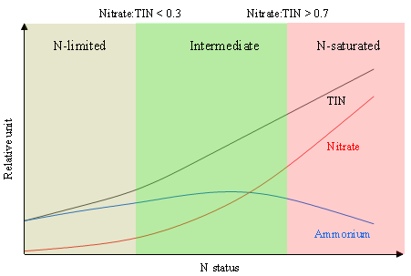 图3 氮限制与氮饱和森林生态系统中土壤总无机氮(TIN)、铵态氮及硝态氮浓度变化示意图。