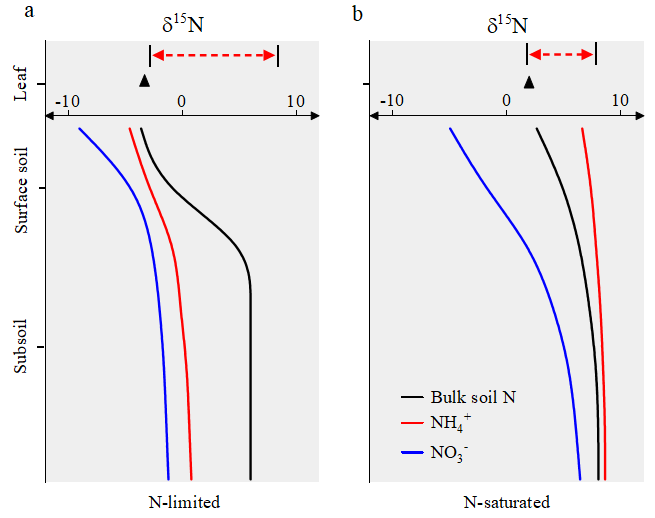 图4 氮限制与氮饱和森林中叶片δ15N以及土壤剖面内土壤全氮、铵态氮和硝态氮δ15N变化示意图。