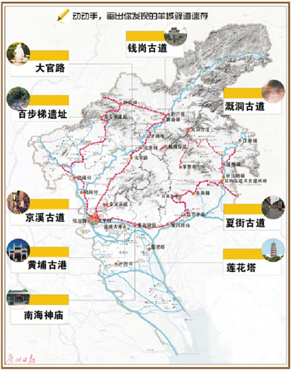 市国土规划委下属的广州市岭南建筑研究中心经过研究和梳理,初步绘制出了羊城驿道遗存地图在展厅内展出,经过考证的历史遗存和重要节点主要有钱岗古道、溉洞古道、夏街古道、莲花塔、南海神庙、黄埔古港、京溪古道、百步梯遗址、大官路等9处。据工作人员介绍,“这些历史遗存仍然在不断地完善中,我们鼓励市民去发现和关注这些古驿道遗存,将新发现的新遗存上报,经过考证后可以加入地图,进一步拓展和丰富羊城古驿道地图。”
