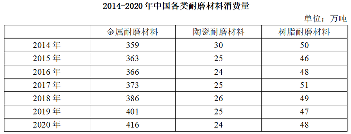 定位表格材料可知:金属耐磨材料、陶瓷耐磨材料、树脂耐磨材料2014年消费量分别为359万吨、30万吨、50万吨;2020年消费量分别为416万吨、24万吨、48万吨。