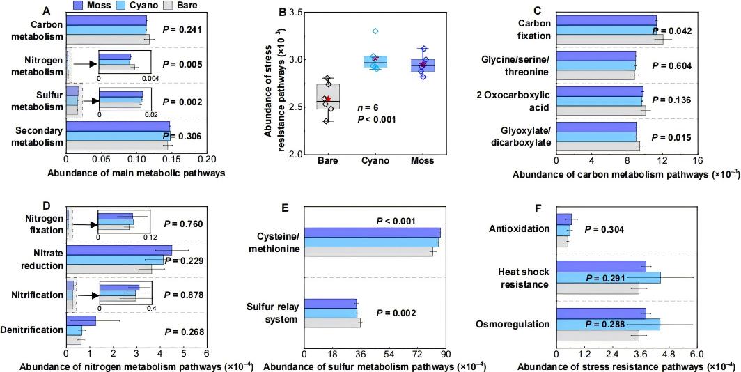 研究结果表明:与无生物结皮的夯土相比,生物结皮覆盖改变了夯土中细菌和真菌群落的基本结构、生境偏好及核心物种,使细菌和真菌群落的丰度、多样性以及互作网络复杂度提高了12%–62%(图2);同时,生物结皮覆盖夯土中微生物群落的总体功能基因丰度和抗逆性代谢通路丰度提高了4%–15%,一些与微生物退化/劣化过程有关的代谢通路丰度则有所降低(图3和图4)。生物结皮对微生物群落的影响主要归因于其对夯土水、热以及养分条件的调控作用,而气候条件(干旱程度)是另外一个重要因素。该研究描绘了长城微生物群落的全貌,明确了生物结皮在主导微生物群落方面的关键作用,为长城及全球干旱区土遗址的保护与修复提供了重要参考。