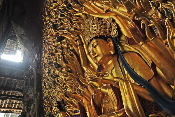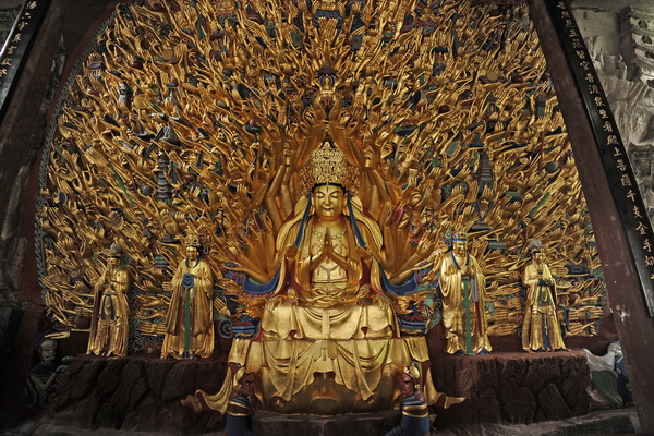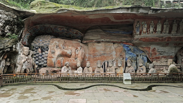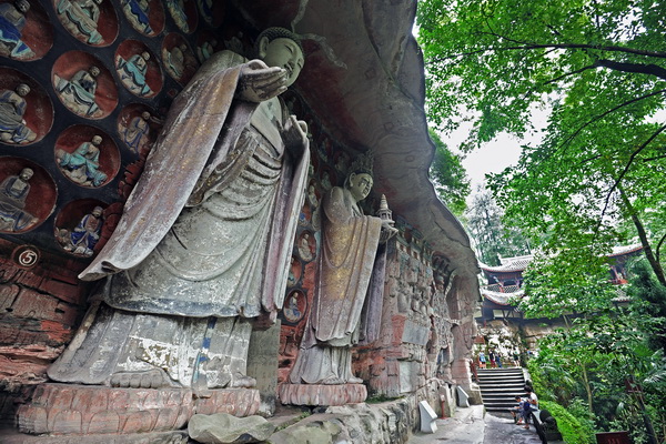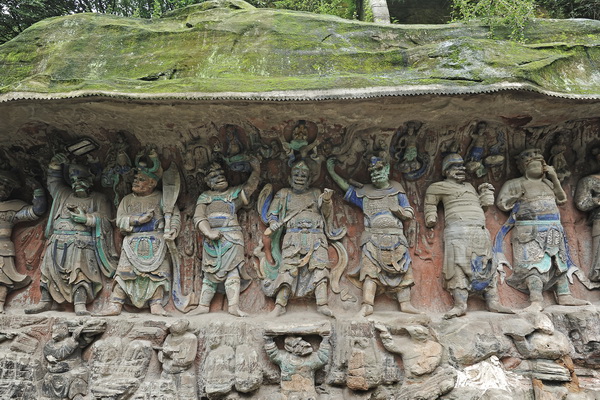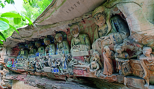 大足石刻以宝顶山、北山、南山、石门山、石篆山等“五山”石窟为代表,是中国晚期石窟艺术的代表作品。它始建于公元650年(唐永徽元年),兴盛于公元9世纪末至13世纪中叶,余绪延至明、清,有造像5万余尊,铭文10万余字。