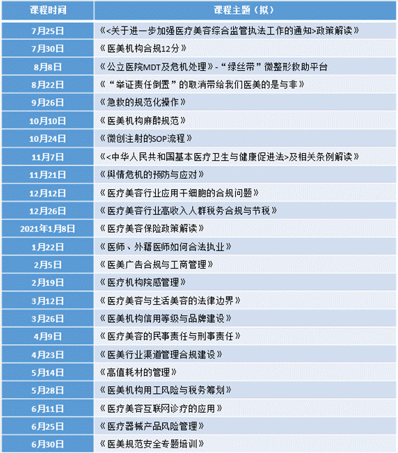 2020成都夏季医美月期间,为深入贯彻落实八部委《关于进一步加强医疗美容综合监管执法工作的通知》文件精神,在成都市经济和信息化局、成都市卫生健康委员会、成都市市场监督管理局的指导下,在高新区管委会、武侯区政府、温江区政府的支持下,由成都市医美产业协会、成都市整形美容质量控制中心、高新区生物产业发展局、华西大健康产业功能区管委会、温江区医美产业协会、北京至瑾律师事务所将开展为期一年的《医美规范安全专题培训》。该培训通过视频直播的方式,共24期,每期60分钟,要求成都所有医美机构全程参加培训。各机构代表需将培训课程转工作群,培训记录和学习考核将纳入成都市整形美容质量控制中心年度考核评分,作为医美机构年审参考材料。