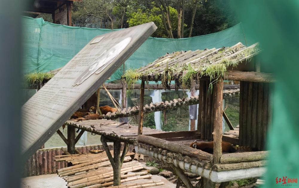 步行大约1小时后,红星新闻记者发现一处围了较高护栏和绿网的展示场,栏杆上挂着多块提示牌“隔离动物展示场 禁止拍照、惊扰”。透过栏杆缝隙,记者才看到多只小熊猫正在场地中间的木制亭子里休息。