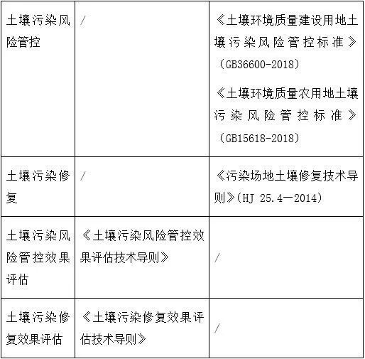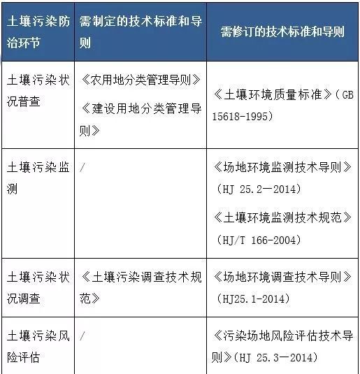 另外,针对土壤污染状况普查、监测、调查、土壤污染风险评估、风险管控、修复、风险管控效果评估、修复效果评估等相关的技术标准和技术规范等,目前需要制定的以及需要进一步修订的详见下表: