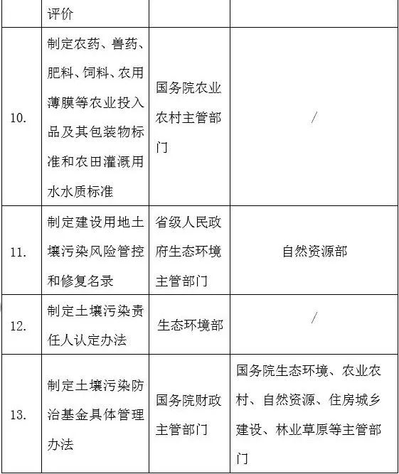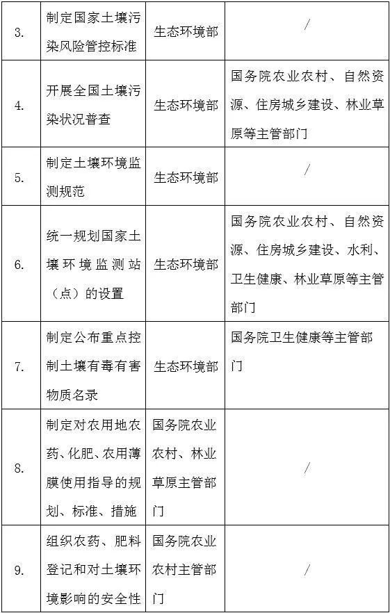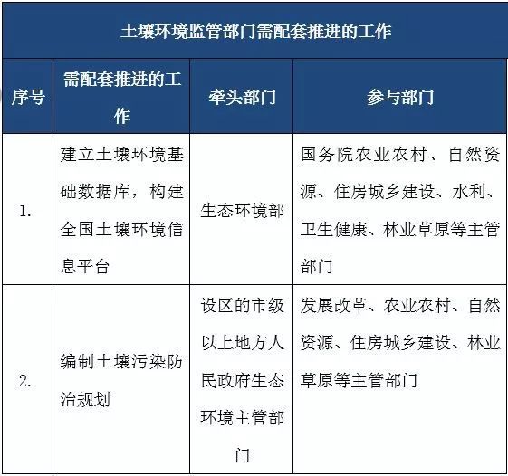 为落实好土壤污染防治法,生态环境主管部门及其他负有土壤污染防治监督管理职责的部门还应当配套推进相关工作,具体见下表: