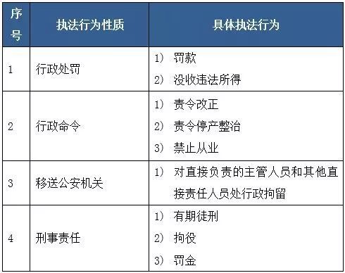 根据土壤污染防治法第六章“法律责任”规定,环境执法部门可作出的执法行为见下表: