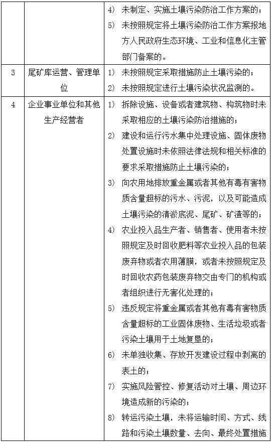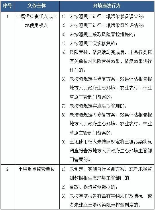 根据土壤污染防治法的规定,相关义务主体如出现了以下环境违法行为,环境执法部门可进行环境执法。具体环境违法行为见下表: