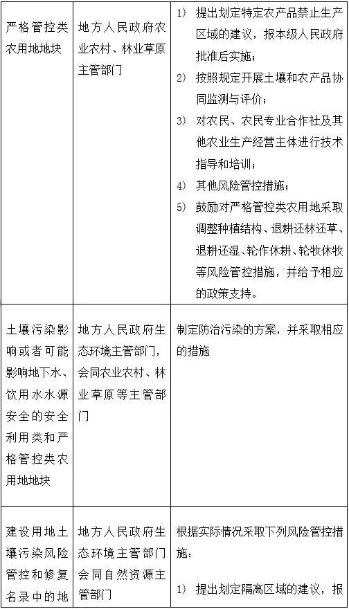 针对不同类别的土地,土壤环境监管部门应当采取不同的风险管控措施,具体见下表: