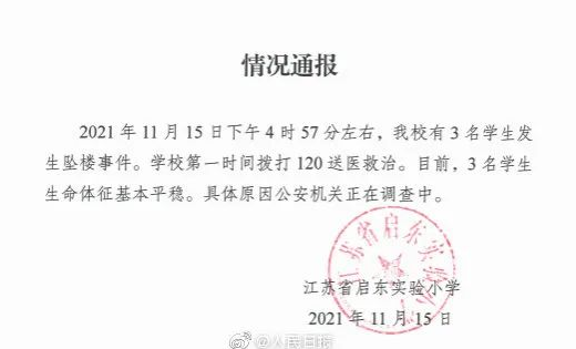 7.江苏启东一小学发生3名学生坠楼事件:15日晚,江苏启东实验小学通报3名学生坠楼事件:学校第一时间拨打120送医救治。目前,3名学生生命体征基本平稳。具体原因公安机关正在调查中。当地相关部门表示,坠楼原因查明后将及时向社会公布。(光明网)