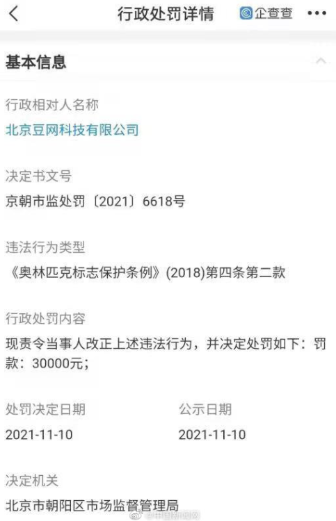 11.豆瓣擅用奥林匹克标志被罚3万:据企查查APP显示,近日,豆瓣关联公司北京豆网科技有限公司新增行政处罚。处罚事由为,违反《奥林匹克标志保护条例》(2018)第四条第二款,未经奥林匹克标志权利人许可,任何人不得为商业目的使用奥林匹克标志。处罚结果为责令当事人改正违法行为,并罚款3万元。(中国新闻网)