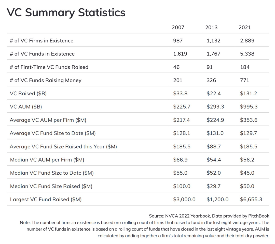 据美国国家风险投资协会(NVCA)数据,VC管理的资本从2007年的2257亿美元上升到2021年的近万亿美元,复合增长率达11.2%。