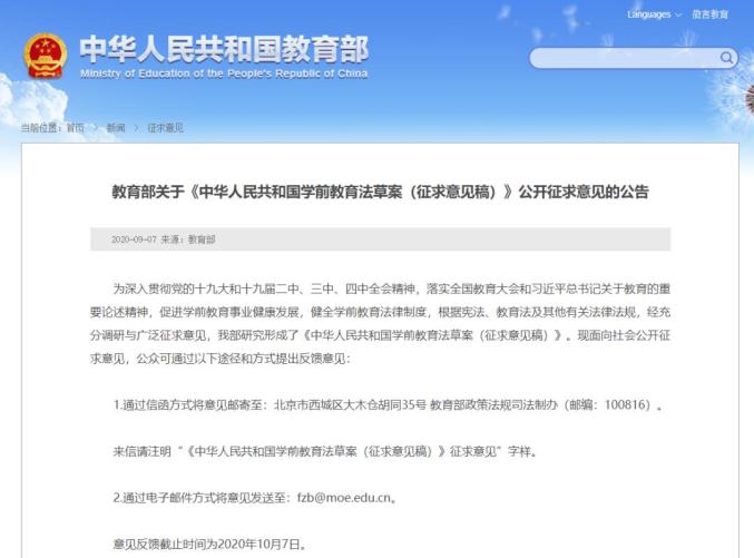 教育部关于《中华人民共和国学前教育法草案(征求意见稿)》公开征求意见的公告