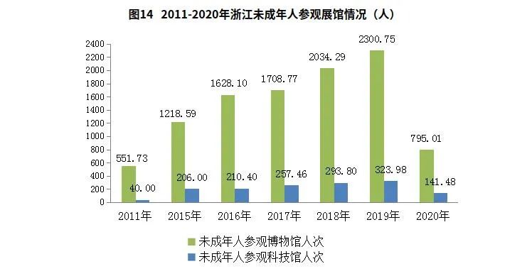 3.儿童文化产品丰富多彩,文化氛围日益浓厚。2020年,全省共有公共图书馆103家,文化馆101家,城市书房604家,乡镇(街道)综合文化站和村(社区)文化活动中心实现全覆盖,乡村30分钟和城市15分钟文化圈基本建成。公共图书馆少儿文献1867.4万册,比2011年增加1459.6万册,增长3.6倍。为农村未成年人群体开设在“美育课堂”,成功入选全省未成年人思想道德建设十件实事之一。未成年人参观博物馆、科技馆人数分别为795.0和141.5万人次,比2011年增加247.8和101.5万人次,增长45.3%和2.5倍。全年播出少儿广播、电视和动画等儿童节目时间分别为11732小时32分、23387小时15分和21989小时39分。出版发行各类少儿图书和少儿期刊总印数分别达到3344和3187万册,比2010年增加20和30.2万册。成功举办多届浙江省未成年人读书节,“追梦之声”浙江省青少年声乐大赛等活动。“十三五”期间,共有19部动画片获中国国际动漫节“金猴奖”,138个广播电视节目、31项活动、61档栏目获“少儿节目奖”为少儿成长提供丰富的精神食粮。