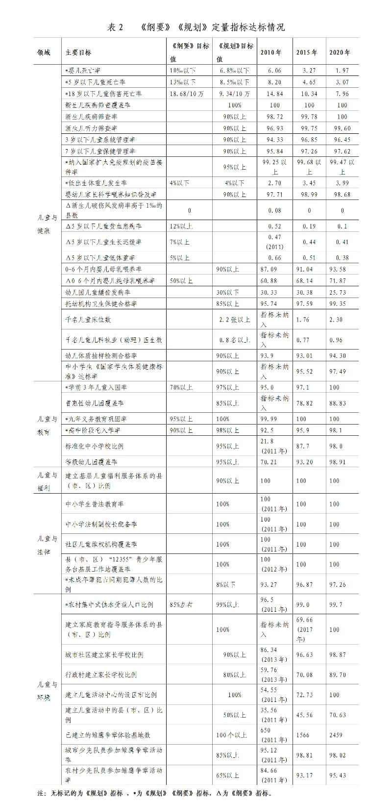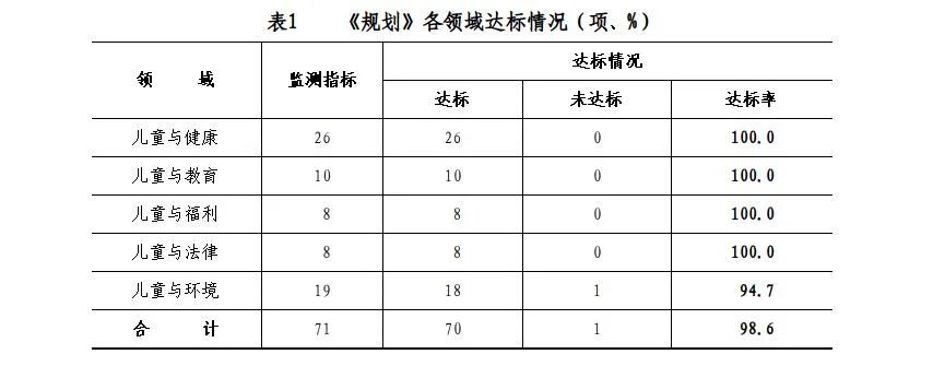 2.《规划》目标达标情况。2020年底,《规划》中涉及的儿童与健康、儿童与教育、儿童与福利、儿童与法律、儿童与环境等五大领域71项主要监测指标,70项达标,总达标率为98.6%;1项未达标,占1.4%。分指标看,39项定量指标全部达标;32项定性指标中;有1项未达标,为“儿童主要文化产品”中的二级指标“儿童音像制品出版”。