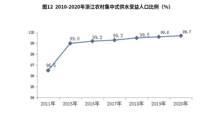 1.儿童生活环境持续改善,美丽浙江成效显著。2020年,人均公园绿地面积约14.2平方米,全省11个地级市全部跻身全国文明城市行列。城市污水处理率、城市生活垃圾无害化处理率和农村卫生厕所普及率为97.7%、100%和100%,比2010年分别提高14.9、1.7和11.1个百分点。农村集中式供水受益人口比例99.7%,比2011年提高3.2个百分点,超过《纲要》14.7个百分点。新时代美丽乡村达标村1.1万个,农村人居环境整治评测全国第一。累计建成国家“绿水青山就是金山银山”实践创新基地8个、国家生态文明建设示范市1个、国家生态文明建设示范县(市、区)24个,数量居全国前列。生态环境质量公众满意度连续9年提升。