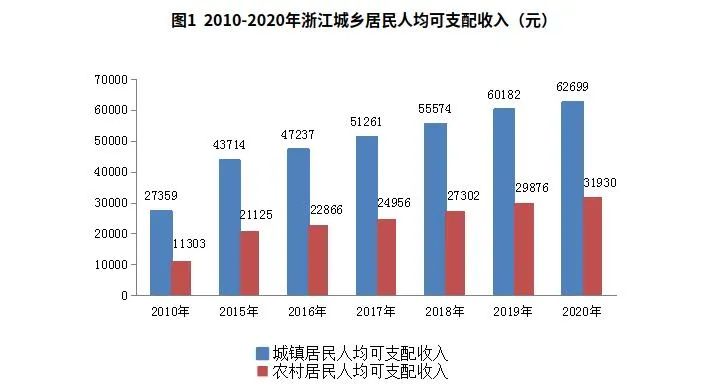 2020年,浙江生产总值64613亿元,占全国6.4%的份额,居全国第4位,超过2019年居世界第17位的荷兰(9091亿美元),与2010年相比增长1.4倍,比2015年增长50.7%倍。人均GDP为100620元(14588美元),约是全国的1.4倍,是2019年世界平均水平的1.22倍以上。全省居民人均可支配收入52397元,居全国第3位、省区第1位,是全国的1.6倍,比2015年增长50.7%。其中,城镇居民人均可支配收入62699元,比2010年和2015年分别增加35340元和18985元,增长1.3倍和43.4%;农村居民人均可支配收入31930元,比2010年和2015年分别增加20627 元和10805元,增长1.8倍和51.2%。经济社会状况稳步发展,综合实力不断增强,为儿童事业的发展奠定良好的经济基础。