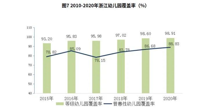 1. 学前教育体系基本建成,普惠共享全面提质。全省通过实施三轮行动计划,基本建成“广覆盖、保基本、有质量”的学前教育体系。“安吉游戏”被教育部—联合国儿基会列入学前儿童质量提升项目,在103所省内幼儿园、15所海内外幼儿园推广实践。2020年,全省幼儿园3年毛入园率达100%,比2010年提高5个百分点,分别超过《纲要》和《规划》目标值28和1个百分点。小学学龄儿童入学率99.99%。全省共有幼儿园8009所。其中,农村公办幼儿园655个;城市公办幼儿园数1457个,比2010增加910个,增长1.7倍。在园幼儿数由2010年的183.1万人增至198.6万人,增加15.5万人,增长8.5%。全省完成城镇小区配套幼儿园治理项目217个,建设农村普惠性幼儿园193所,基本实现乡镇中心幼儿园全覆盖。等级幼儿园覆盖率和普惠性幼儿园覆盖率分别为98.9%、88.8%,超过《规划》目标值3.9和3.8个百分点,比2015年提高5.7和10个百分点。
