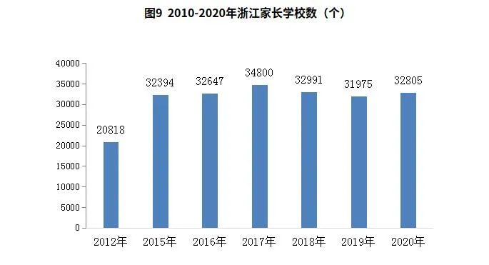 4.家庭教育持续注重,体系建设稳步推进。以实施家庭建设综合平台为抓手,深入贯彻习近平总书记“注重家庭、注重家风、注重家教”的重要指示精神,家庭教育指导服务体系建设稳步推进,家庭教育指导服务站点规范化建设逐步建强,2019年,联合认定135所中小学、幼儿园家长学校,65个村(社区)家长学校(家庭教育指导站点)为省示范家长学校(家庭教育指导站点)。持续开展“家庭家教家风大讲堂”“家庭教育圆桌会”等活动,帮助孩子扣好人生第一粒扣子。“浙江家长学校”数字资源上线,被教育部评为全国基础教育工作典型案例。2020年,全省建立家庭教育指导服务体系的县(市、区)比例达到100%,达到《规划》目标。家长学校数3.28万个,与2012年比增加1.2万个,增长57.7%;培训人次数485.9万人次,比2012年增加310.2万人次,增长1.8倍。城市社区、行政村建立家长学校比例分别达到98.9%和89.7%,与2013年比提高12.5和30个百分点,超过《规划》目标值8.9和9.7个百分点。