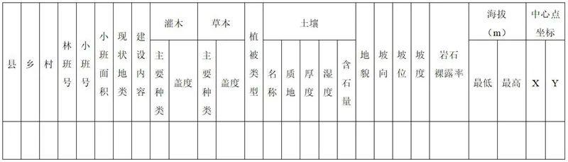 填表说明:1.立地因子的调查和划分标准执行《云南省森林资源规划设计调查操作细则》(云南省林业厅,2013年修订);2.灌木、草本的主要种类调查填写3种以上;3.“植被类型”根据现状调查的植被情况,依据《云南植被》中采用的分类原则、单位和系统,并参考《中国植被》、《云南森林》等植被专著确定。