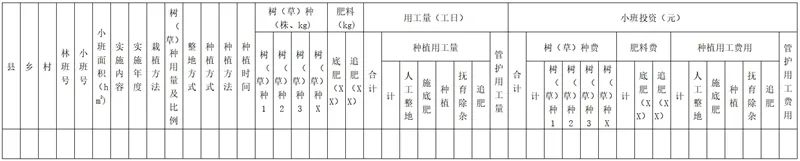 填表说明:根据方案设计的主要技术模式和措施,进行小班区划。样表仅作为参考,可根据实际建设内容进行增减、调整。表格内容应包括但不限于以下内容:统计反映各小班采取的技术模式和措施,树(草)种及用量、肥料用量、栽植(配置)方法、用工量和小班投资等内容。