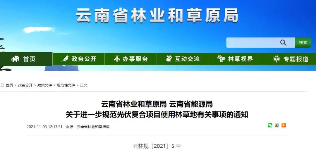 云南省林业和草原局、云南省能源局近日联合印发《关于进一步规范光伏复合项目使用林草地有关事项的通知》,通知自印发之日起生效,《云南省林业厅关于规范光伏电站建设使用林地的通知》(云林林政〔2016〕17号)自本通知印发之日起不再执行,适用范围包括纳入各级可再生能源发展“十四五”规划的光伏复合项目。